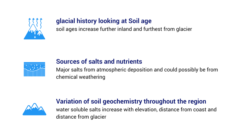 From this Diaz was able to conclude that soil chemistry varies throughout the regions by looking at salt concentration and how it increases based elevation, distance from the coast, and distance from the glacier.